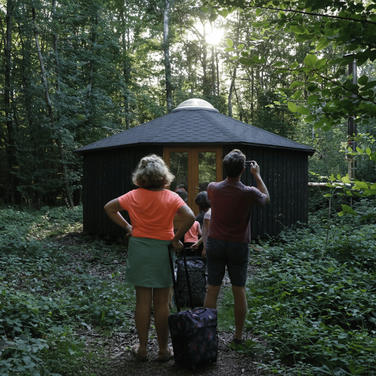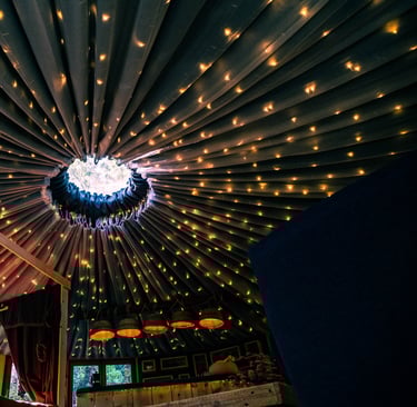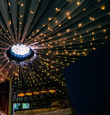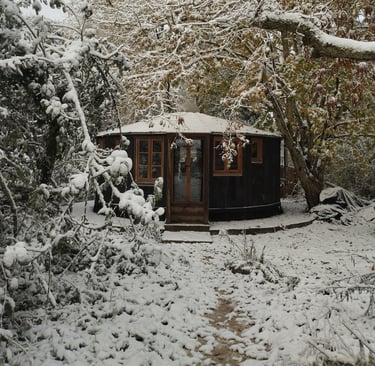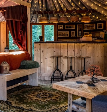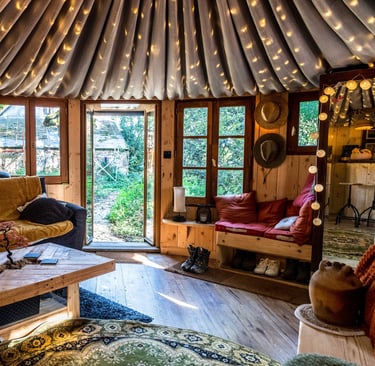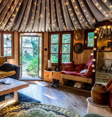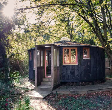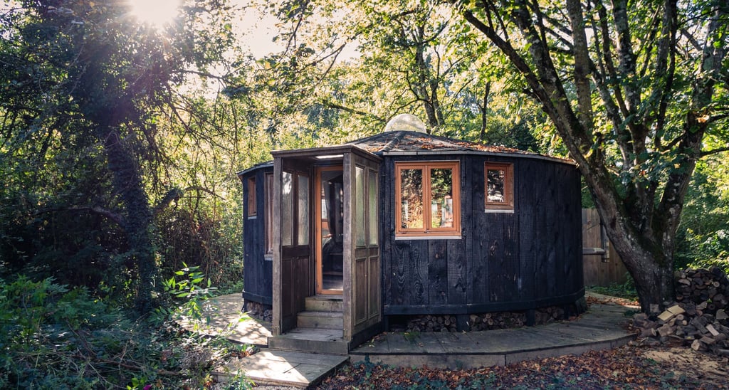 Description : yourte en kit livrée sur place, 30m², posée sur pilotis en acacia au milieu d'un bois, tenture aux cloisons, sol OSB brut