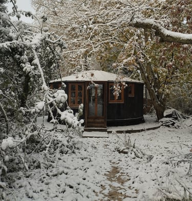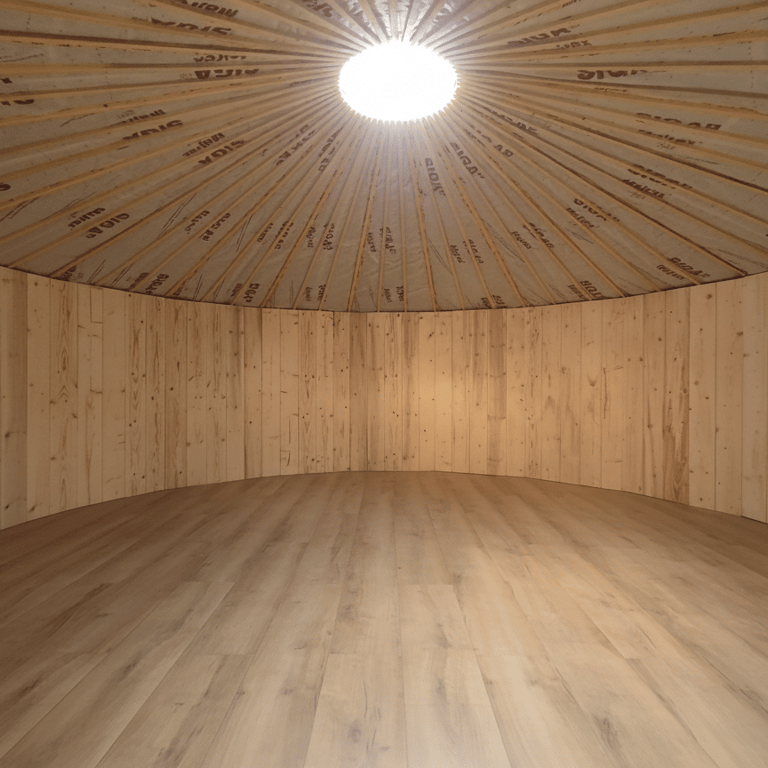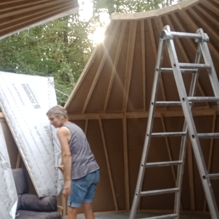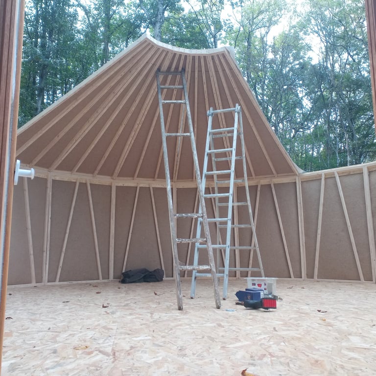 Description : yourte légère prête à monter, isolation 60mm de laine de bois, posée sur dalle béton dans jardin, bardage bois intérieur, parquet flottant